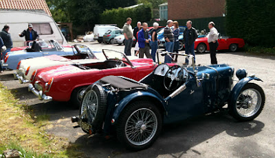 September brought us a gloriously sunny day and five spridgets in a range of patriotic colours. Rob & Jenni had got their blue k-midget back on the road after a few months of repair work, John & Carol came down from County Durham in their red Sprite which had just passed it's MOT, and Tim & Sarah were in their white Sprite. Then what could be a more patriotic colour than British Racing Green, the colour of Alan's RWA, who came up from Doncaster. Harvey & Leslie also came across, and we all had great pie. There are some pictures here of the meeting.
